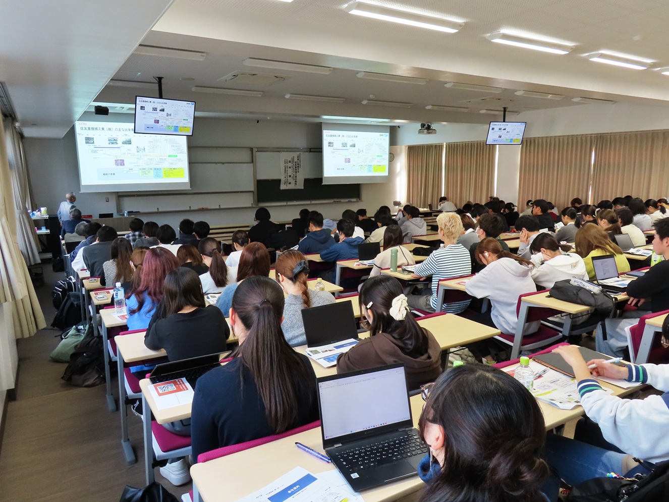 2025年11月14日(金)、社会共創学部社会共創学(伊予銀行)講座主催により、講演会「えひめのしごと―世界に飛躍する“住友重機械工業の戦略”―」を開催し、社会共創学部、法文学部などの学生や教職員約110人が参加しました。