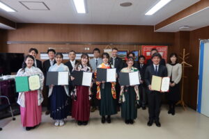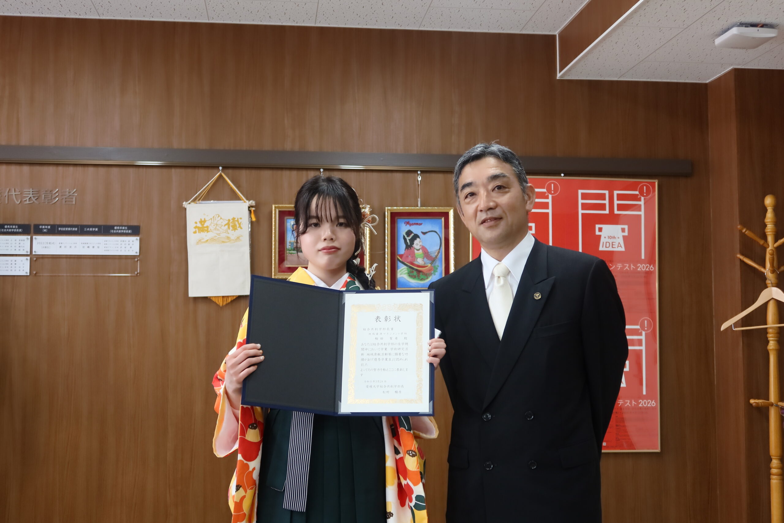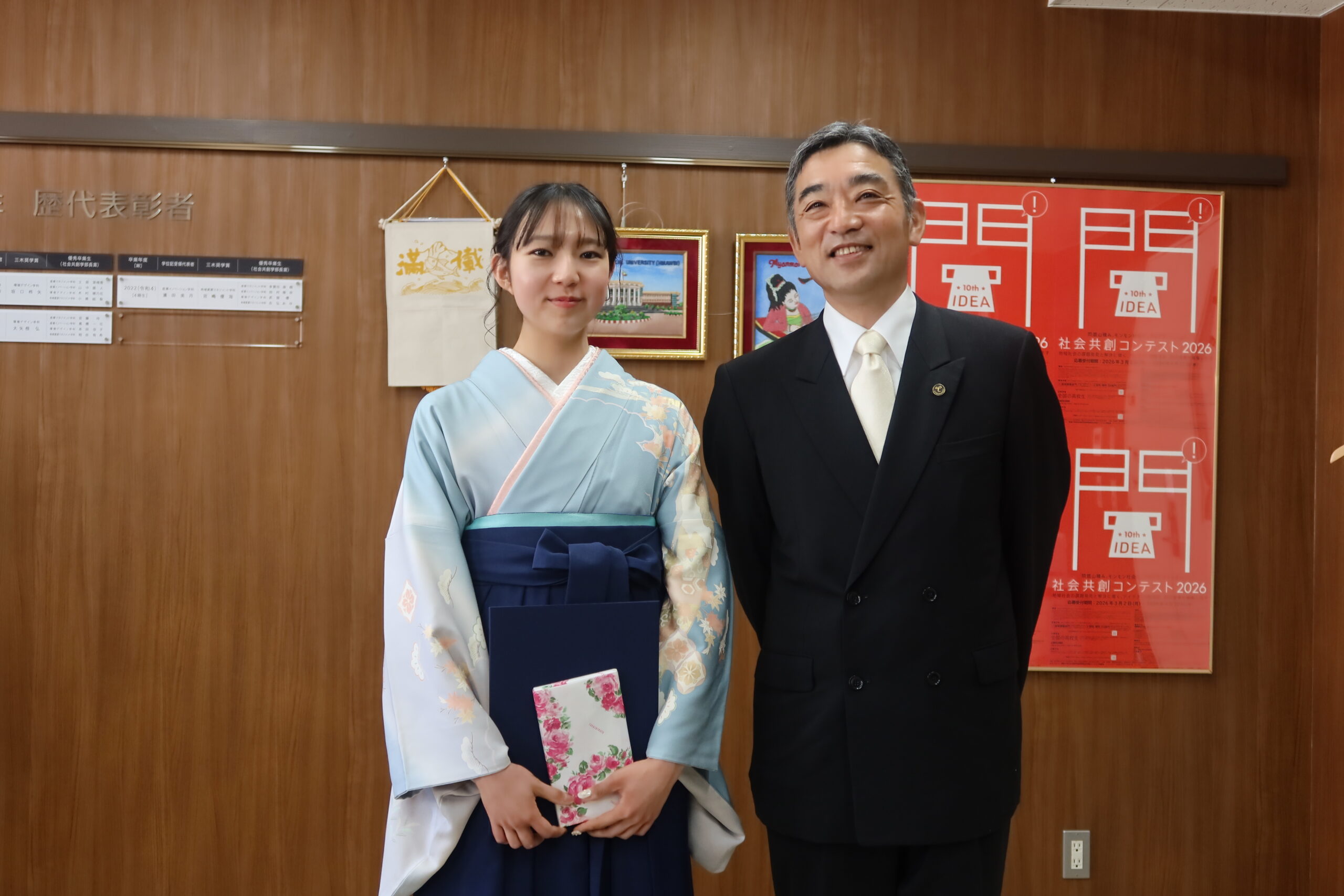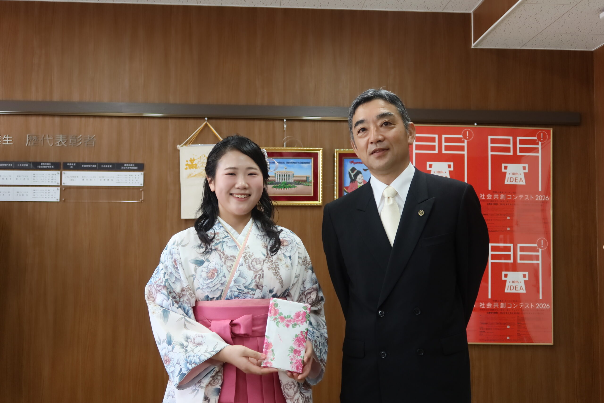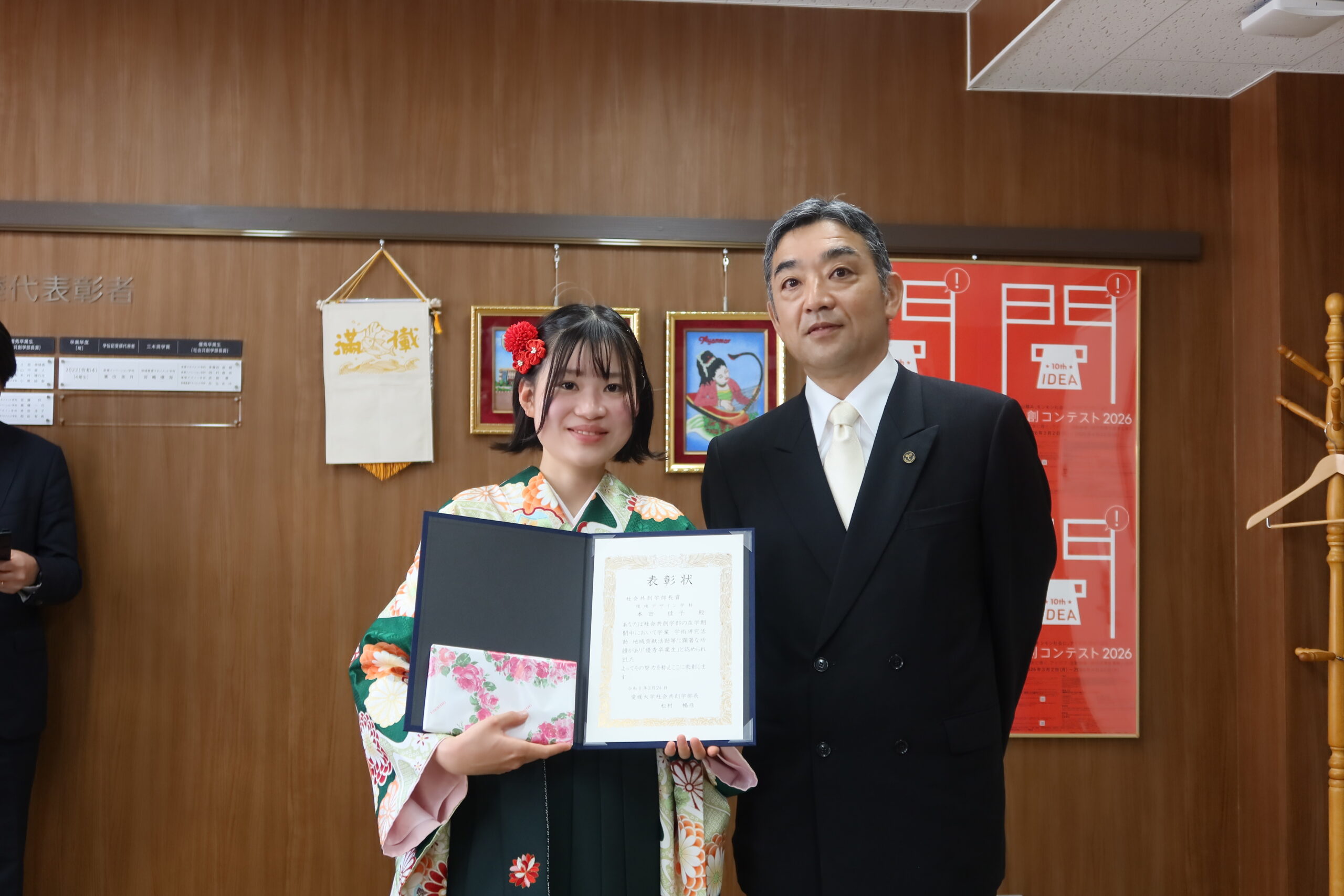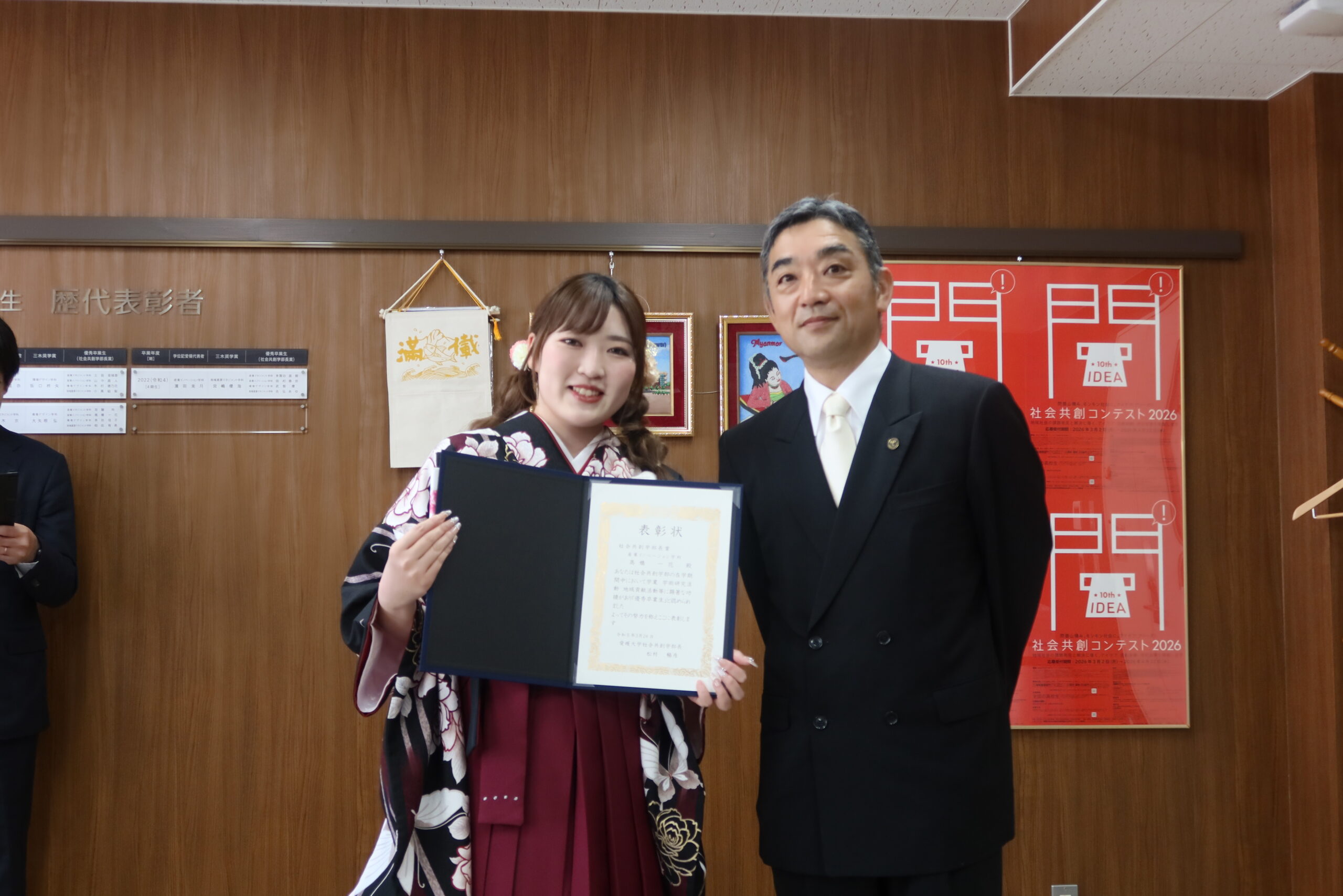 社会共創学部では、在学中に特に顕著な功績を挙げ、学部学生の模範となる優秀な卒業生を表彰しており、その表彰式を同日、社会共創学部長室にて執り行いました。表彰式では、受賞者の皆さんに表彰状や記念品を贈呈し、松村暢彦社会共創学部長から祝辞を送りました。