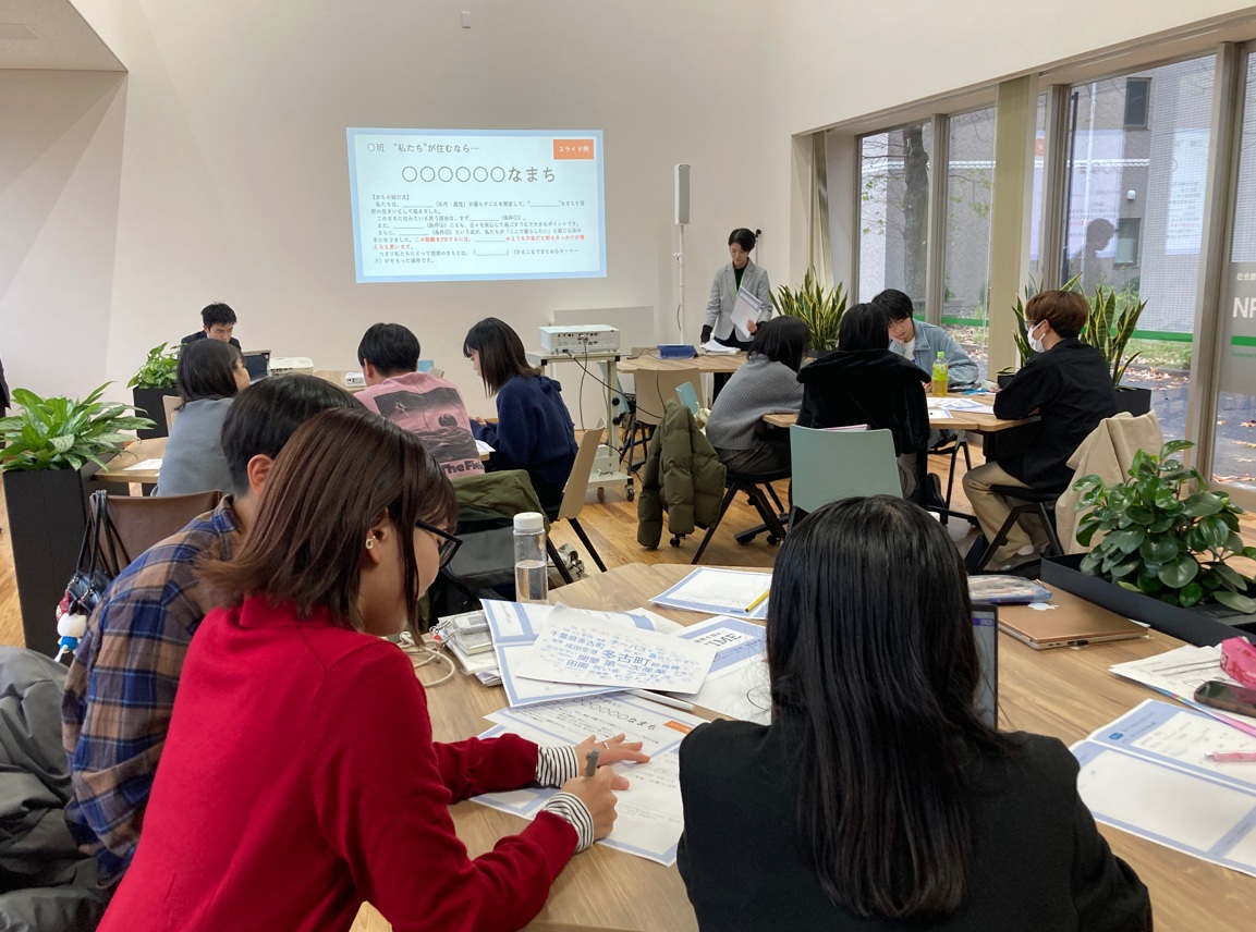 この中では、まず学生が「子育てしやすいまちの秘密を探れ!」など3つのテーマに関する事前課題を発表し、テキストマイニング分析を活用しながら参加者間の情報や意識を共有しました。そのうえで「私たちが住みたいまち」をテーマに、若者が重視する生活環境や行政からの支援の在り方などについて、具体的なアイデアを出し合いながら検討しました。