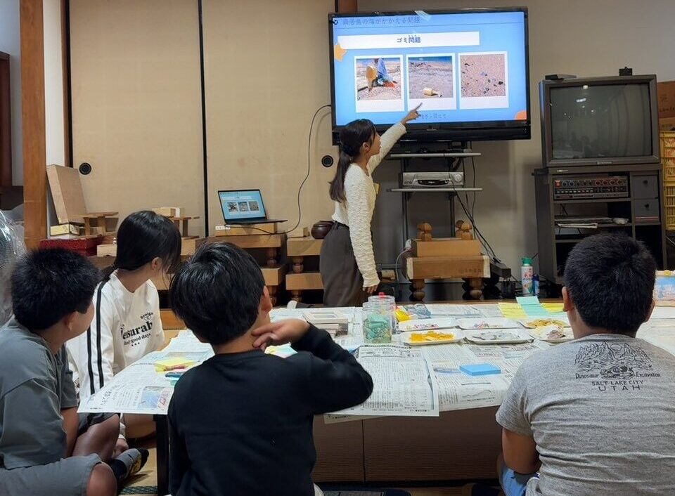 今回は、「ごごしまキッズスクール」の場をお借りし、「わたしたちと海 〜興居島の海について考えよう〜」と題した活動を行いました。興居島の特徴の1つとして、海に囲まれた豊かな環境があると感じたため、メンバーと話し合いこのような内容で進めることとなりました。