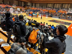 プログラム期間中は、キャンパスツアーやアイスブレイクを通じて交流を深めた後、愛媛オレンジバイキングスの練習視察や試合観戦を行い、スポーツ現場とデータ分析の関係性について理解を深めました。あわせて、事前に取り組んだスポーツデータ分析課題の発表や共同ディスカッションを実施し、「このプレーは、データでどう捉えられるのか」「競技現場をどのように数値化できるのか」といった問いについて活発な議論が交わされました。